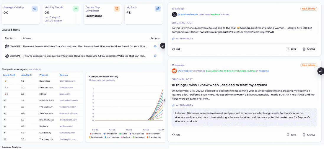 Get real-time feeds from Reddit, X, LinkedIn, and Bluesky with direct links to every relevant conversation about your product or industry.
